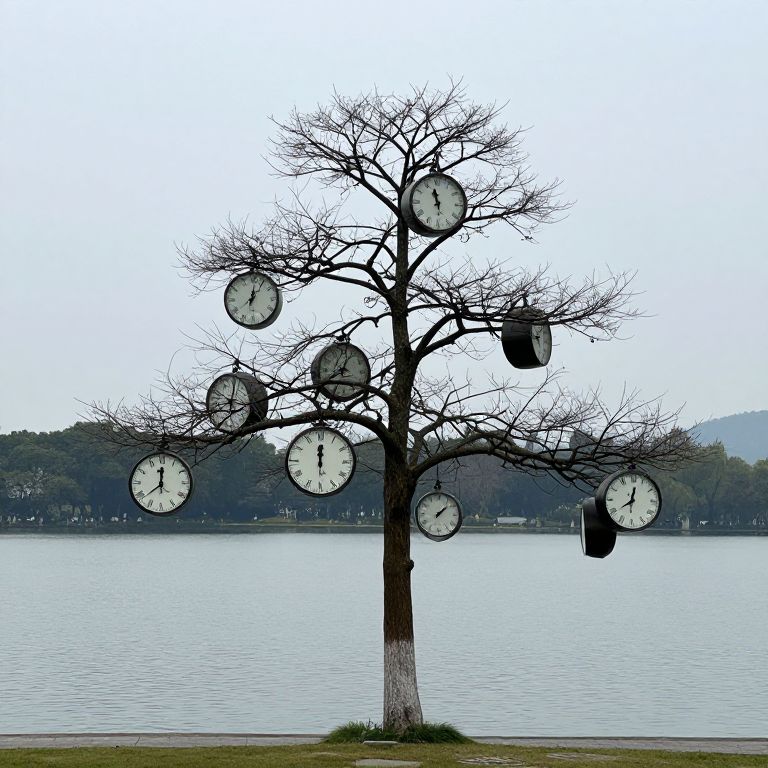 A clocktower grows like a tree from the center of a lake, each branch bearing clocks chiming different time zones in synchronized disarray.