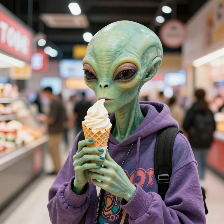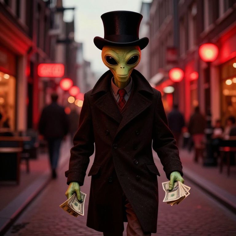 Retro photo of an alien walking through the red light district of Amsterdam. The alien is wearing a top hat and coat to avoid detection . He is holding a fistful of dollars,