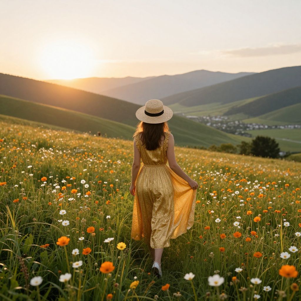 A woman stands gracefully in a vibrant meadow, her golden dress and straw hat blending harmoniously with the sunlit landscape of orange and white wildflowers, as the distant mountains and setting sun frame a serene, picturesque valley.