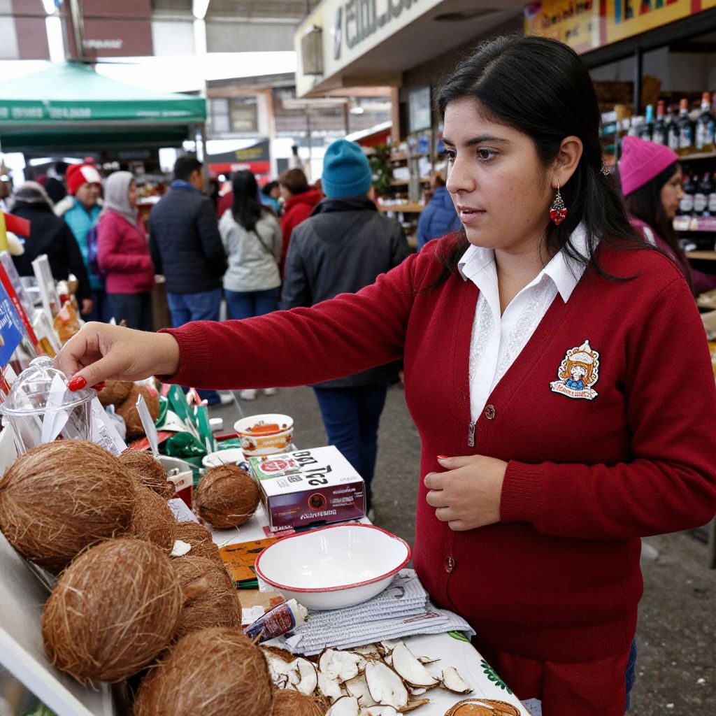 Photograph of a Latina woman with dark hair, wearing a red cardigan and white shirt, selling coconuts at a bustling outdoor market.