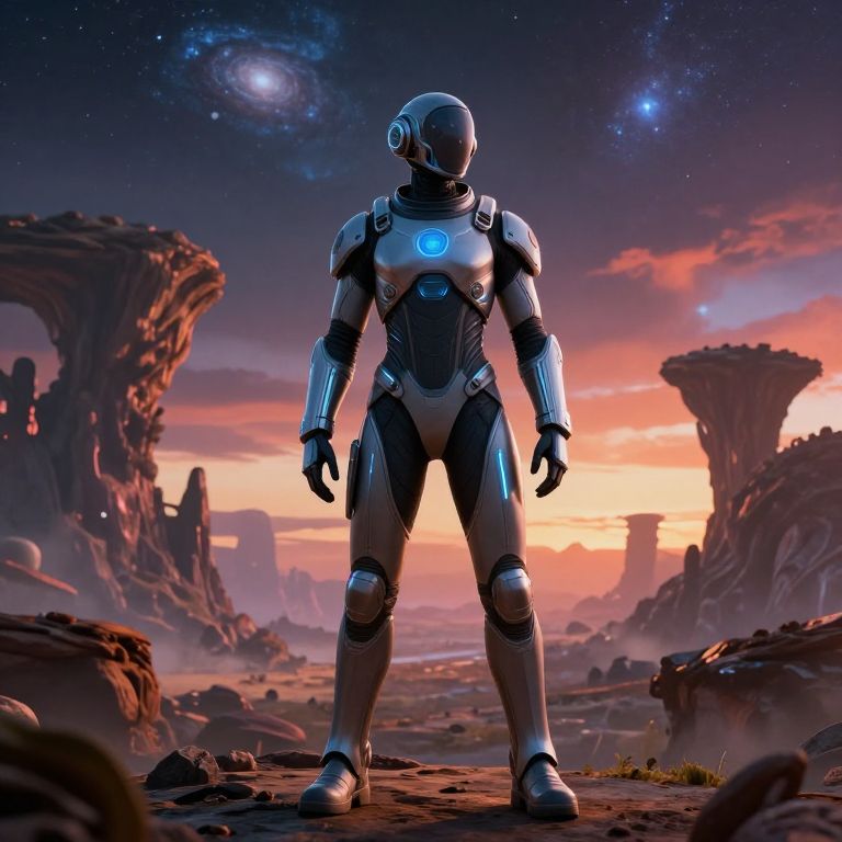 This is a CGI-rendered image of a futuristic, humanoid robot standing in a surreal, alien landscape at sunset. The robot, featuring sleek, metallic armor with glowing blue accents, stands upright with a robust, muscular build. Its head is a smooth, helmet-like structure with a glowing blue visor. The background showcases an otherworldly landscape with large, rocky arches and distant, colorful mountains under a starry, twilight sky. The ground is rocky and uneven, with patches of green grass. The image combines a science fiction aesthetic with realistic textures and lighting, creating a dramatic, futuristic atmosphere.