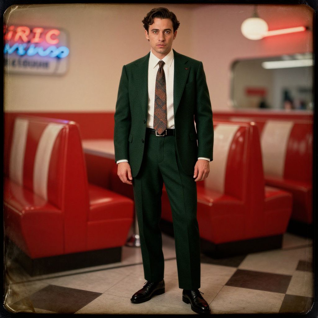 A man, dark green wool suit, white textured dress shirt, patterned silk tie, black leather derby shoes, sleek black leather belt, vintage diner, red vinyl booths, neon signs glowing, collodion wet plate style, confident expression. Man has masculine face and piercing eyes