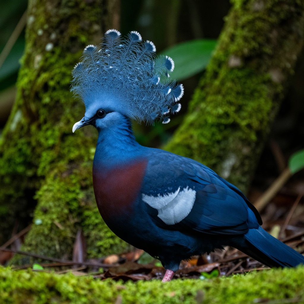 Close-up of a Victoria crowned pigeon (Goura victoria) standing on moss-covered ground in a dense rainforest. The bird has vibrant blue feathers, a distinctive crown of feathers, and prominent black and white markings on its wings. The background features mossy tree trunks and lush green foliage.