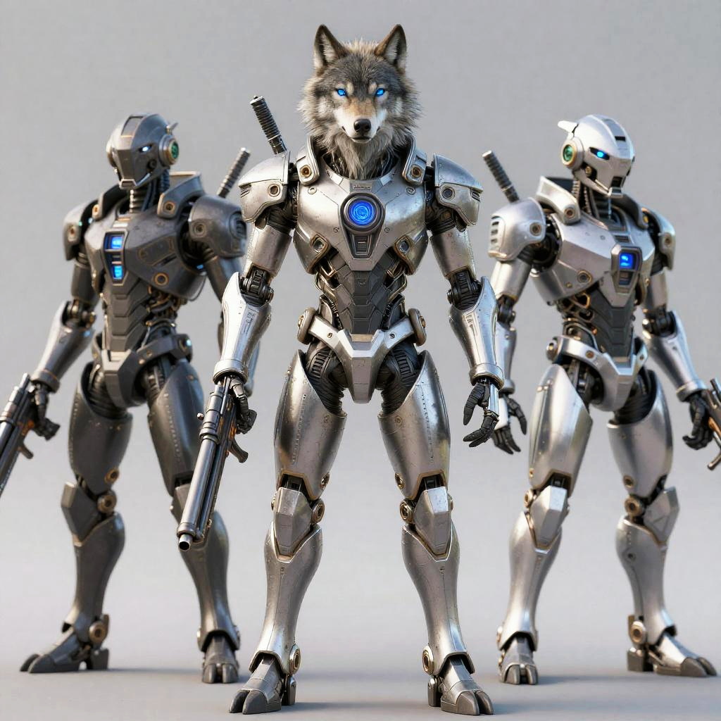 Male, solo, wolf, photorealistic, scifi, mammal, group, machine, anthro, armor, human, helmet, weapon, robot, hi res, science fiction, ranged weapon, blue eyes, canine, canid, gun