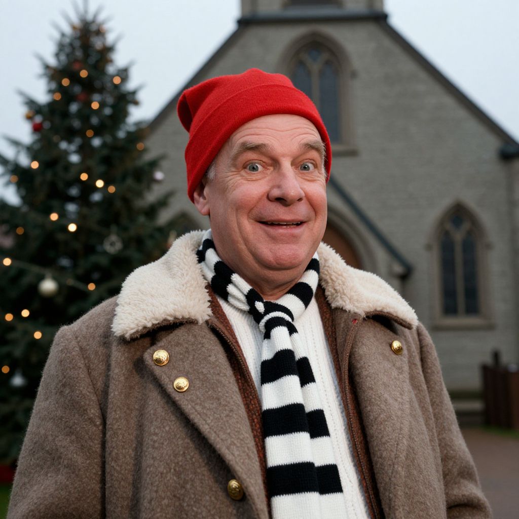 Photograph of a middle-aged white man with a round face, wearing a bright red beanie, brown wool coat with a white shearling collar, and a black-and-white striped scarf. He has a friendly, slightly goofy expression with wide eyes. The background features a blurred church with gray stone walls and two tall, decorated Christmas trees with white lights. The man is centered in the frame, and the image is taken outdoors in a festive setting. The lighting is natural, and the overall mood is cheerful and holiday-themed.