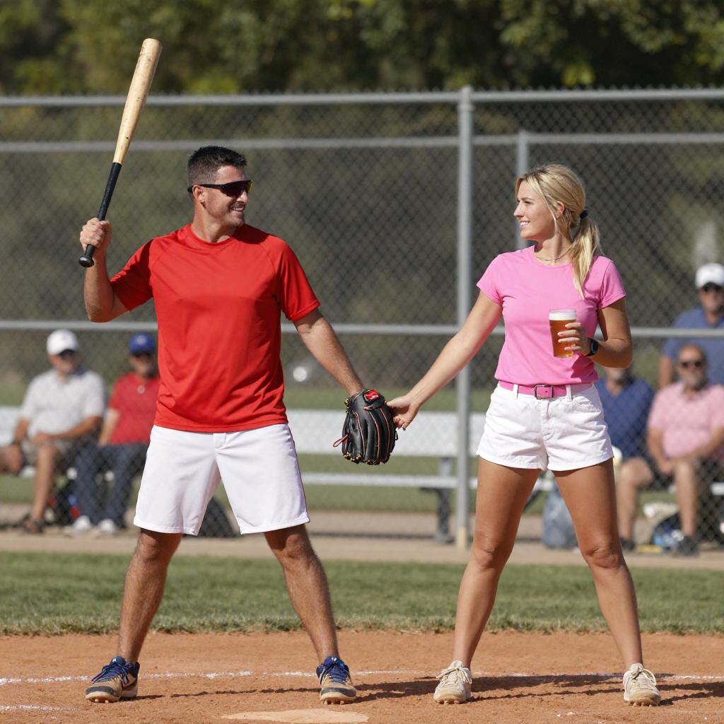 Photograph of a man and a woman walking outdoors. Man with short curly brown hair, light purple t-shirt, smiling at woman. Woman with blonde ponytail, light blue t-shirt with white , smiling at man. Green, blurred forest background. Both facing each other. Casual, happy atmosphere.