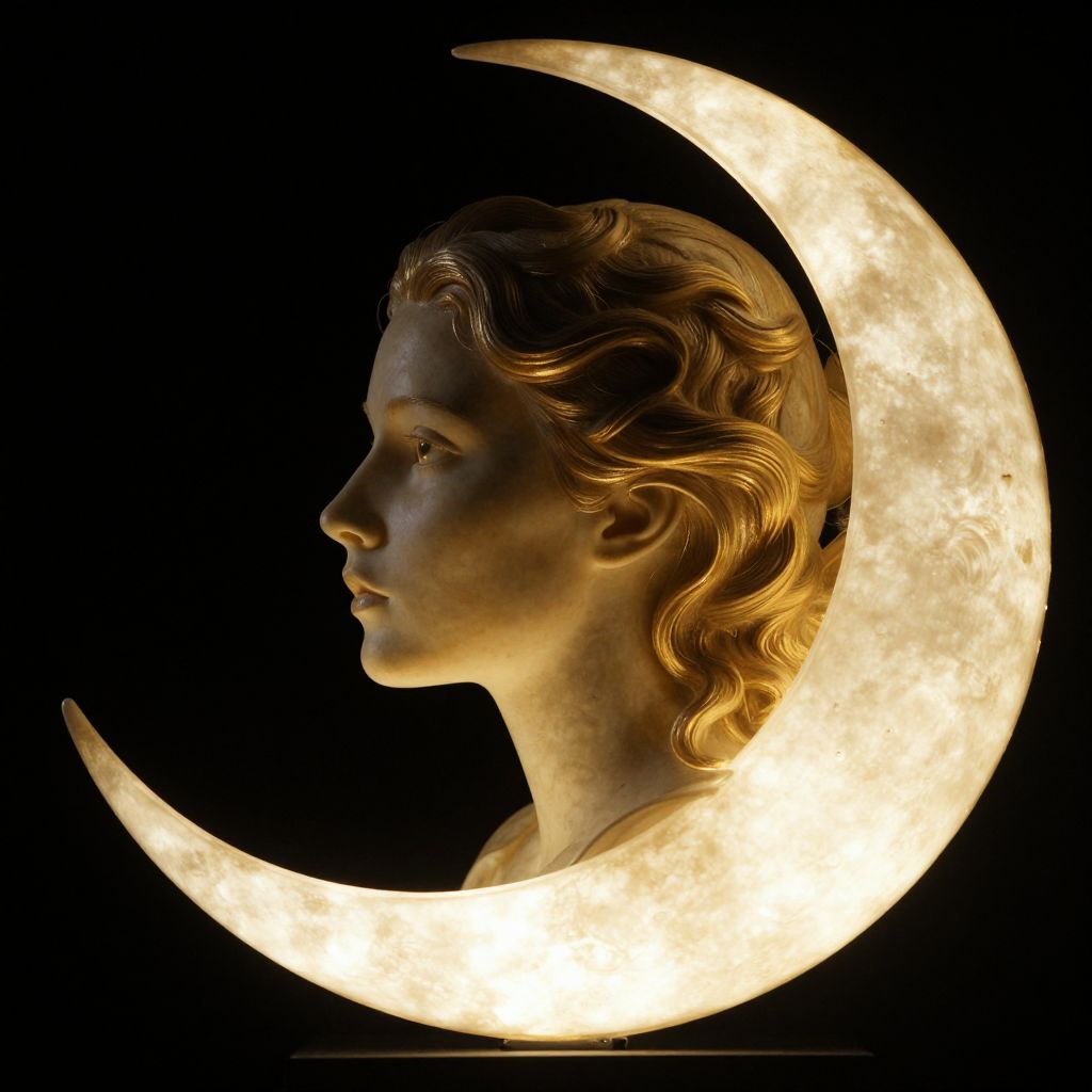 Ethereal sculpture of a woman's profile emerges from a luminous crescent moon, her serene visage illuminated by golden light that accentuates her textured hair and delicate features against a stark black background.