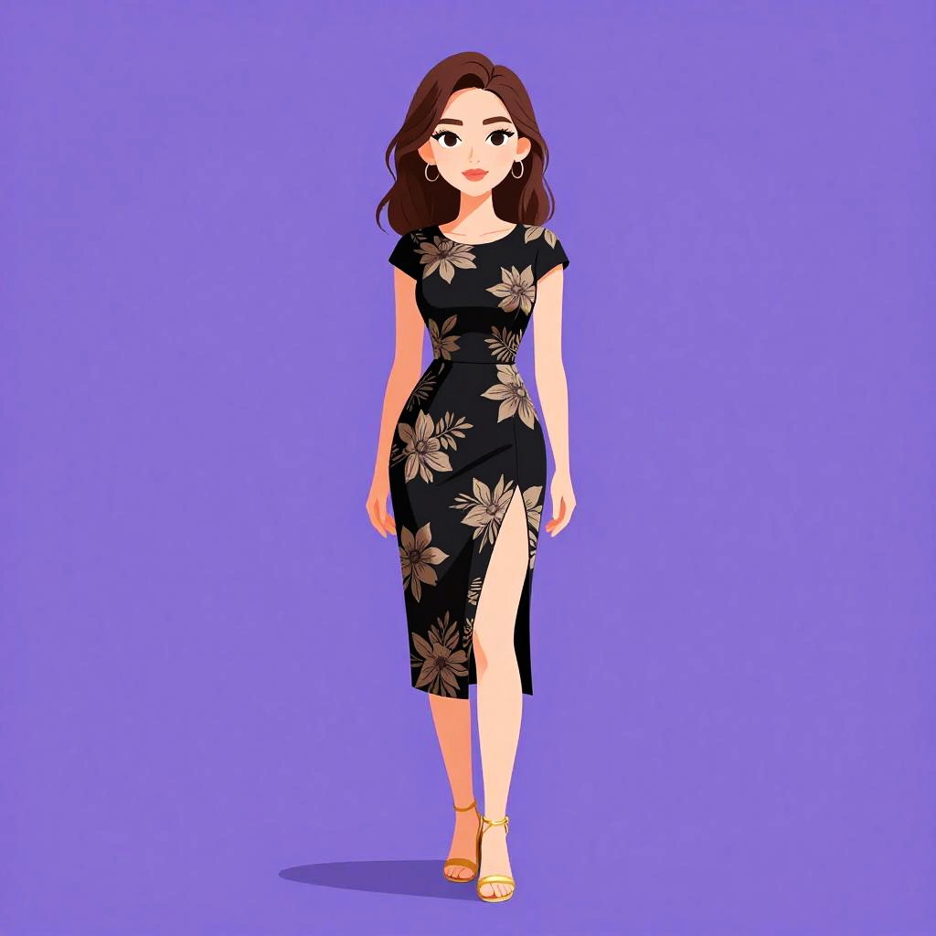 Illustration of a woman with a pretty face and braided hair, wearing a minimalist elegant sheer panel midi dress in pastel lilac. The dress features a scoop neck, thin straps, fitted bodice, and a sheer flared skirt with a solid underlay mini skirt. She is wearing transparent heels, with no visible jewelry, standing against a solid lilac photo studio background.