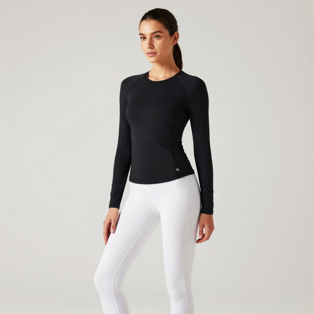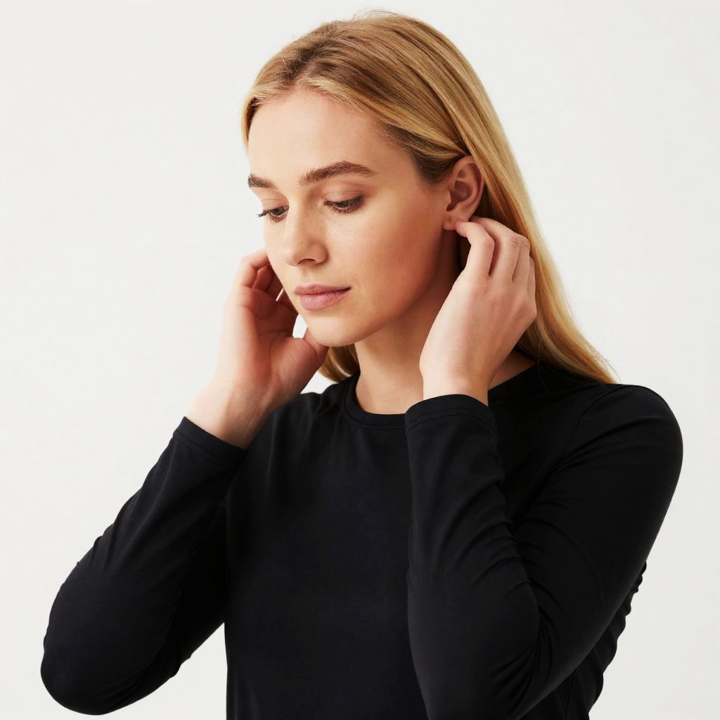 Photograph of a blonde woman with long, straight hair, wearing a black long-sleeve top. She is looking down, touching her left ear with both hands. Soft, white background. Her facial expression is neutral and focused.