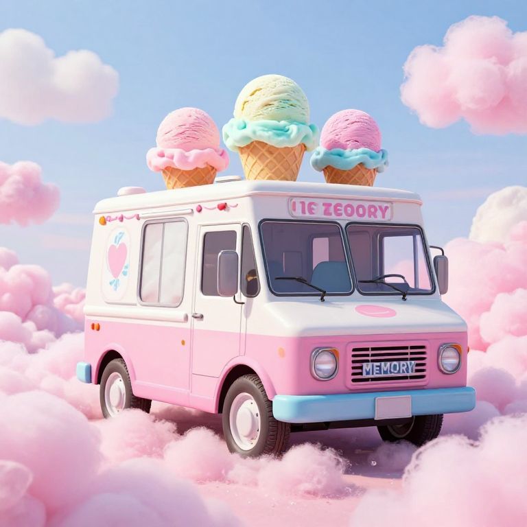 Ice cream truck perched atop a sea of fluffy pink cotton candy, its roof adorned with three towering scoops of pastel-colored ice cream, while the license plate reads \"MEMORY,\" evoking a whimsical blend of nostalgia and sweetness against a serene sky dotted with clouds.
