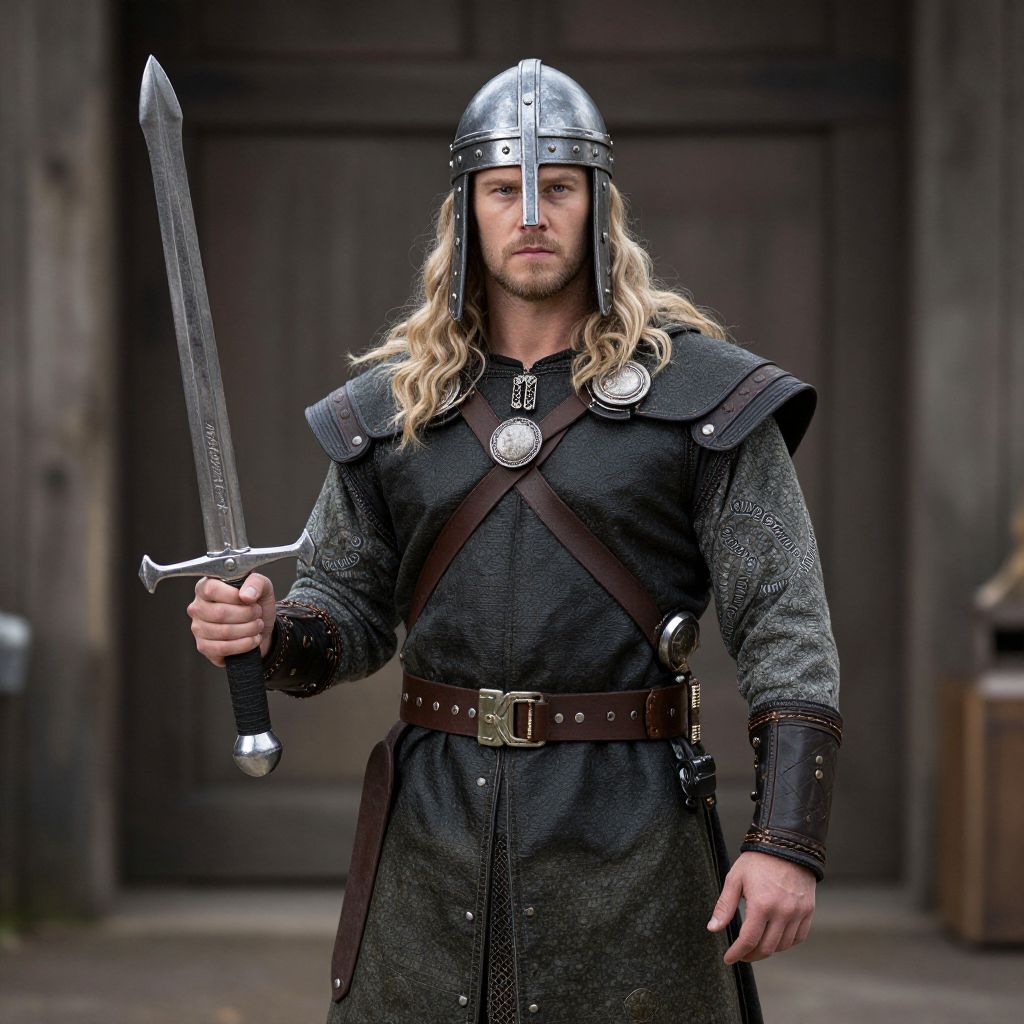 Photograph of a muscular, blonde Viking warrior with long hair, wearing a steel helmet, black chainmail, and brown leather belt, holding a sword