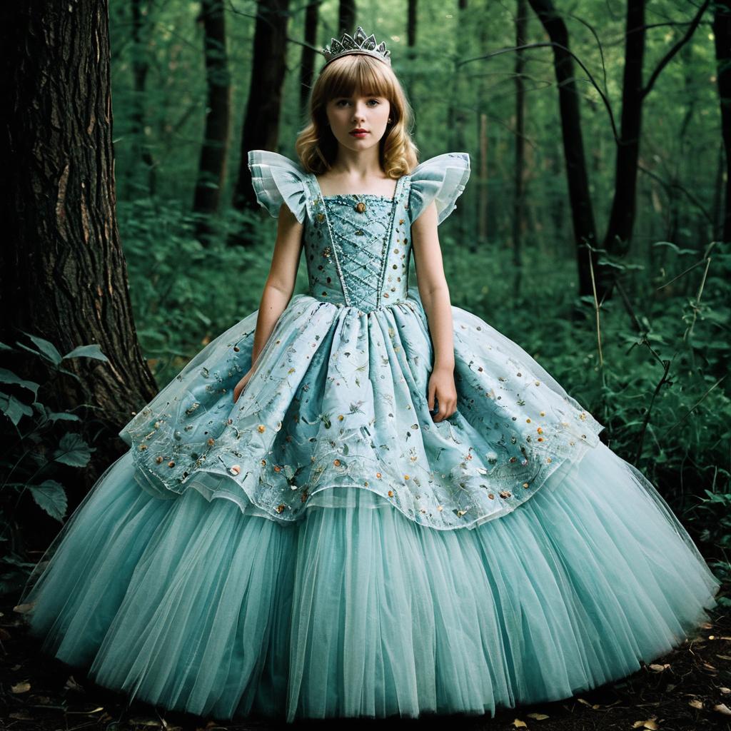 A portrait photography of child female is shown in an intelligently stylized fantasy portrait photography, wearing a whimsical gown, inspired by a fairy tale princess, with intelligent use of composition and inspired by Cindy Sherman, featuring inspiring use of tulle and unique repeating patterns.