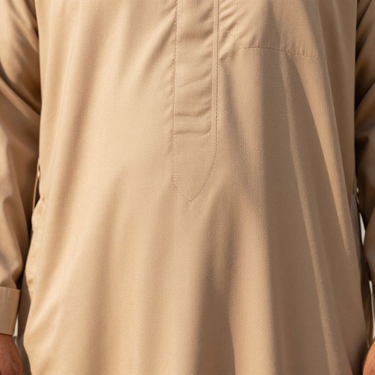 Close-up photograph of a beige, long-sleeved, buttoned shirt with a single, slightly curved pocket, capturing the fabric's texture and subtle
