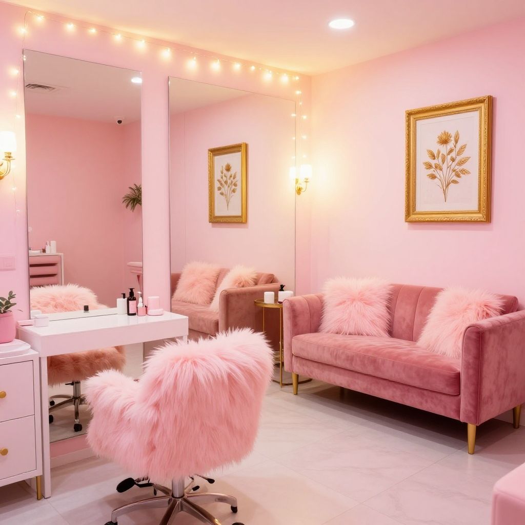 Bright pink aesthetic salon with fluffy cushions, mirrored walls, delicate fairy lights, plush velvet couches, decorative gold framed artwork, and a calming ambiance for clients indulging in luxury treatments