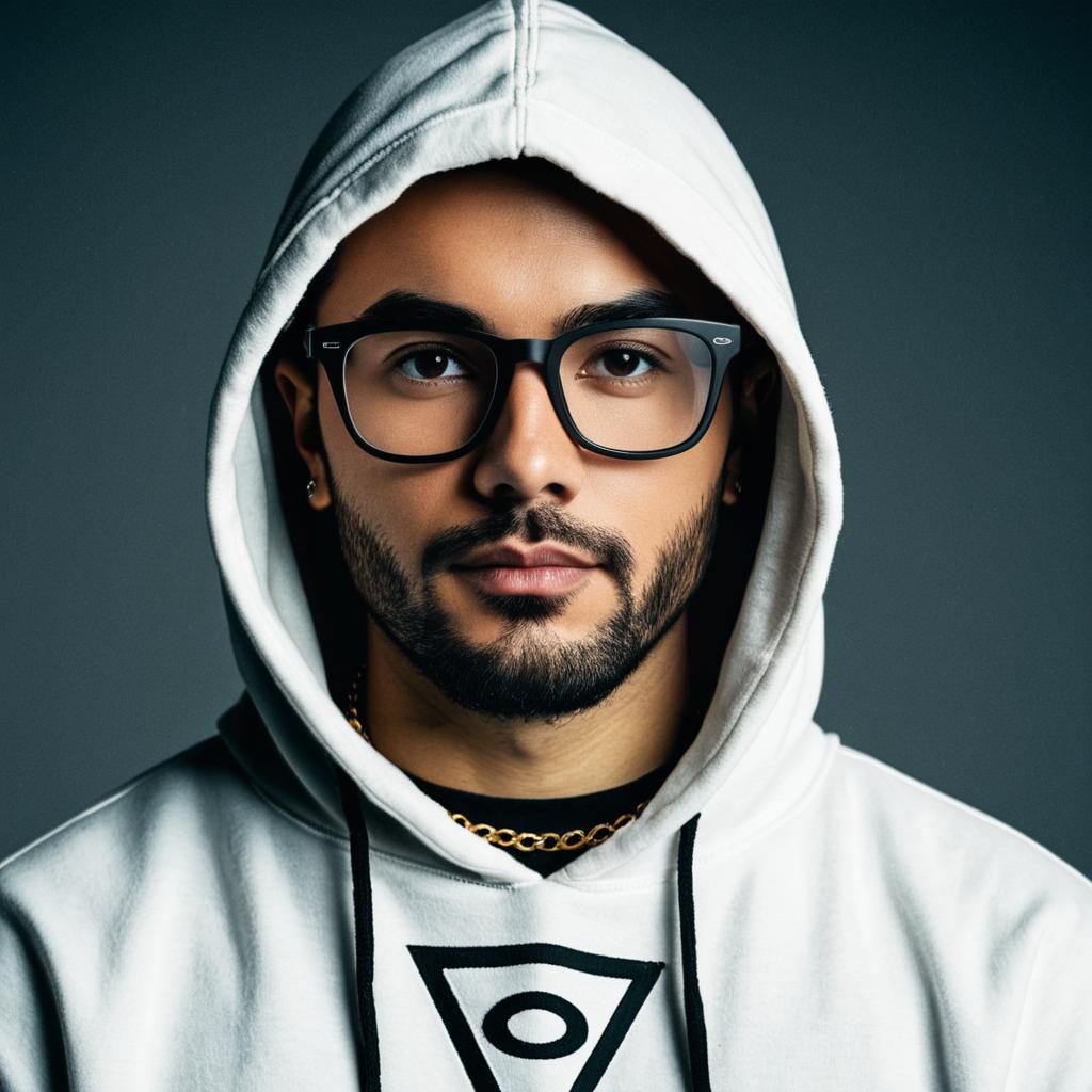 Black eyed peas costume ,1boy, hood, male focus, solo, glasses, realistic, necklace, hoodie, jewelry, facial hair, looking at viewer, hood up, long sleeves