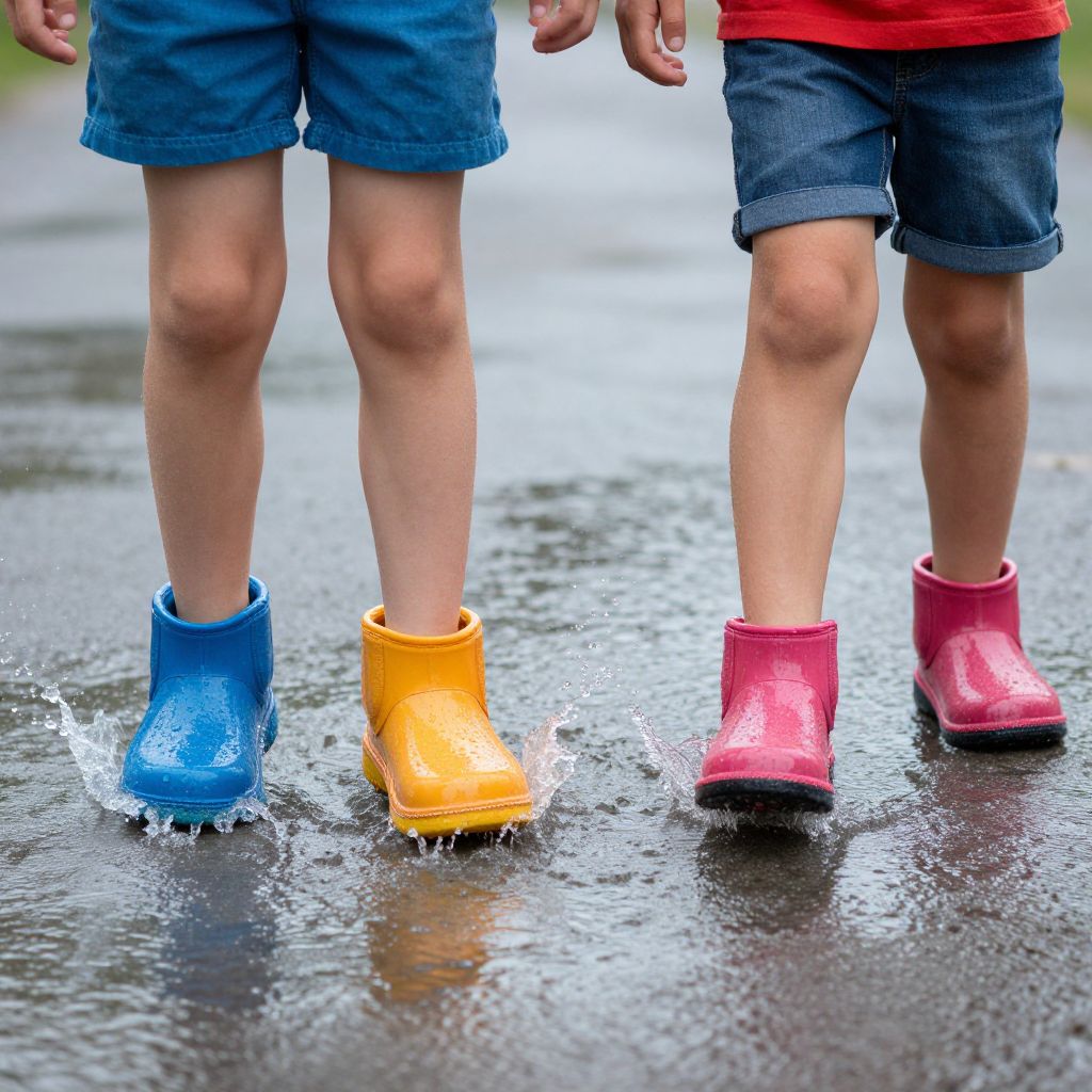 Children's colorful stiefel splashing through puddles on a rainy day, joyful and playful atmosphere, bright reflections and water droplets captured in dynamic motion, vibrant and lively scene