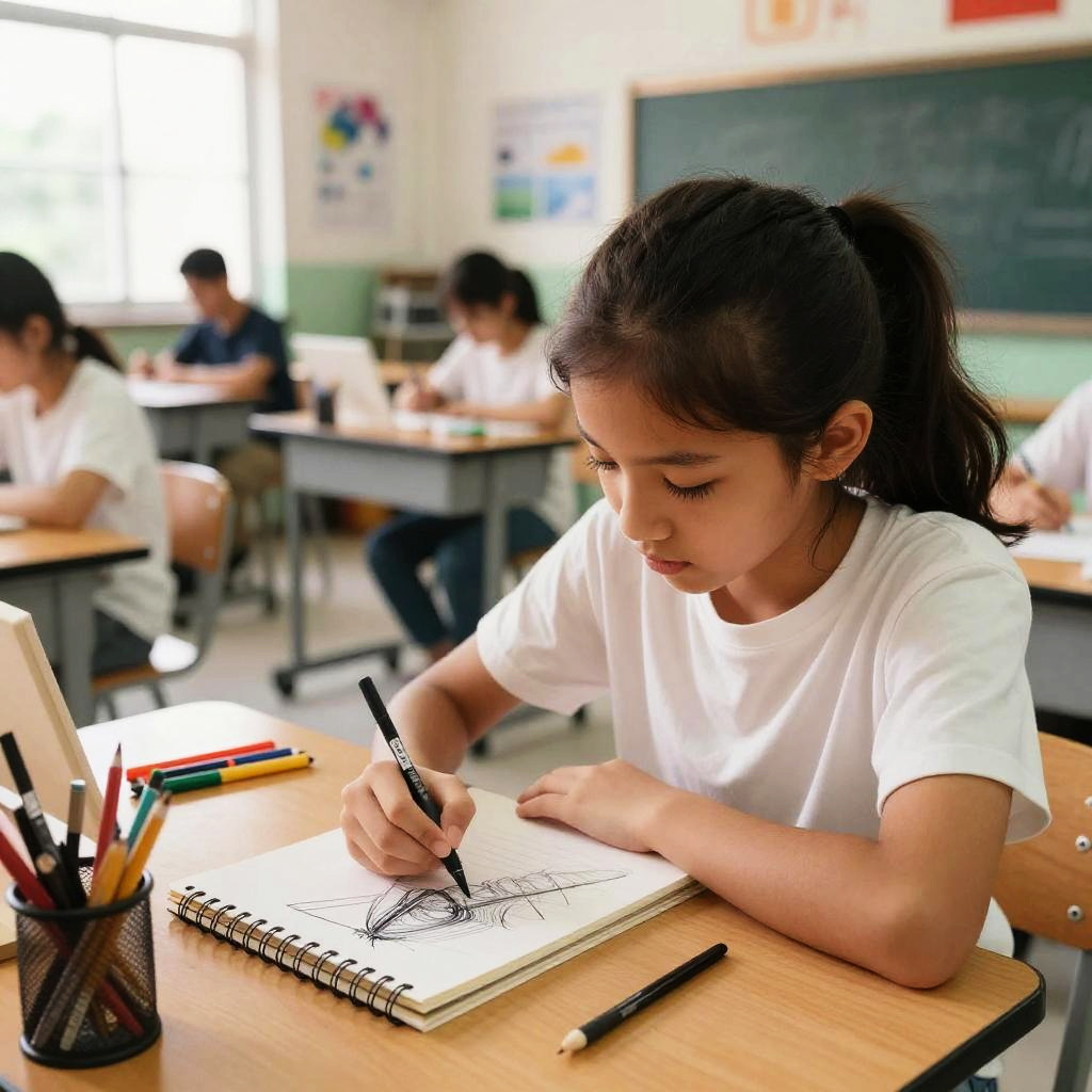 Photograph of an Asian girl with dark hair in a ponytail, wearing a white t-shirt, sitting at a wooden desk in a brightly lit classroom. She is focused on drawing in a spiral-bound notebook with a black pen in her right hand. On her desk, there's a black mesh pencil holder with colored pencils, a closed notebook, and a black pen. In the background, other students in white shirts are seated at desks, with a large chalkboard on the right and colorful posters on the wall. The classroom has a clean and organized atmosphere.
