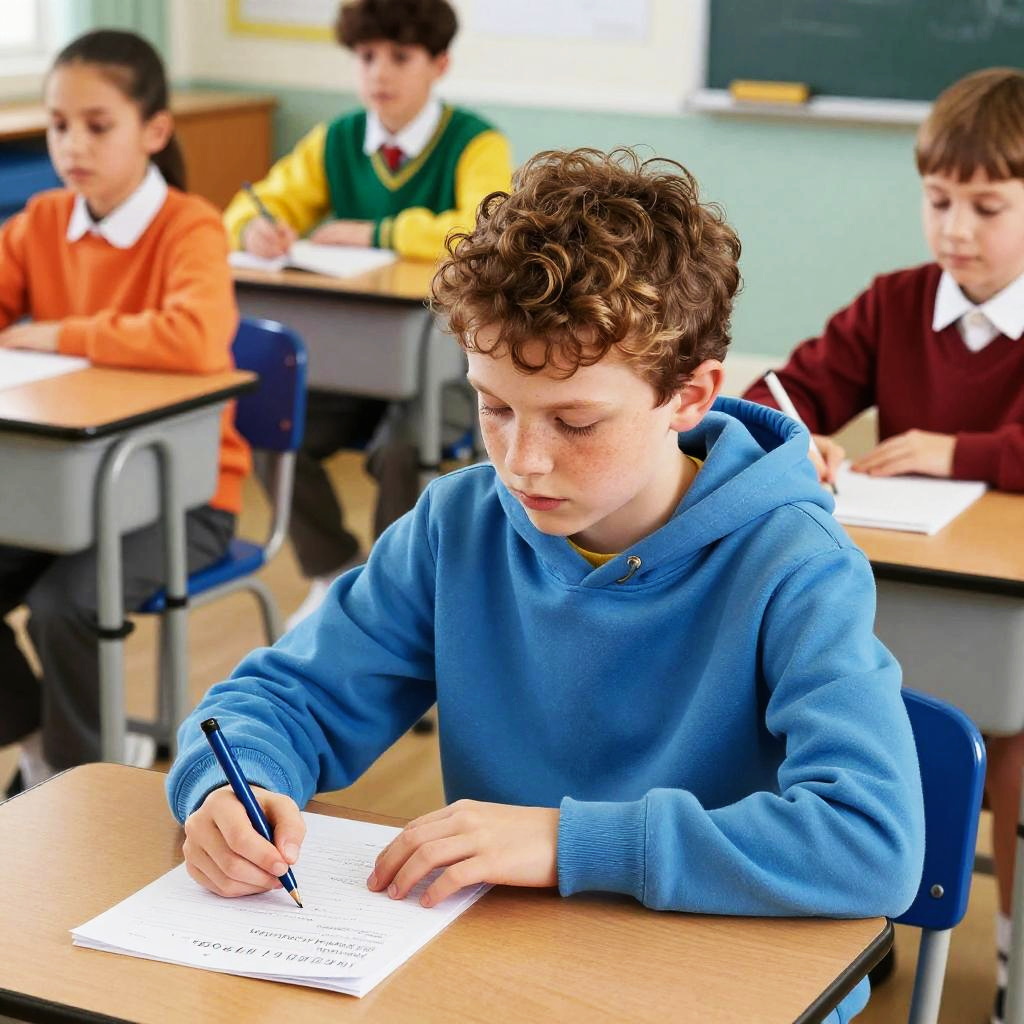Photograph of an Asian girl in a white shirt, writing in a notebook at a classroom desk, surrounded by other students.