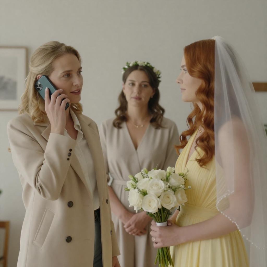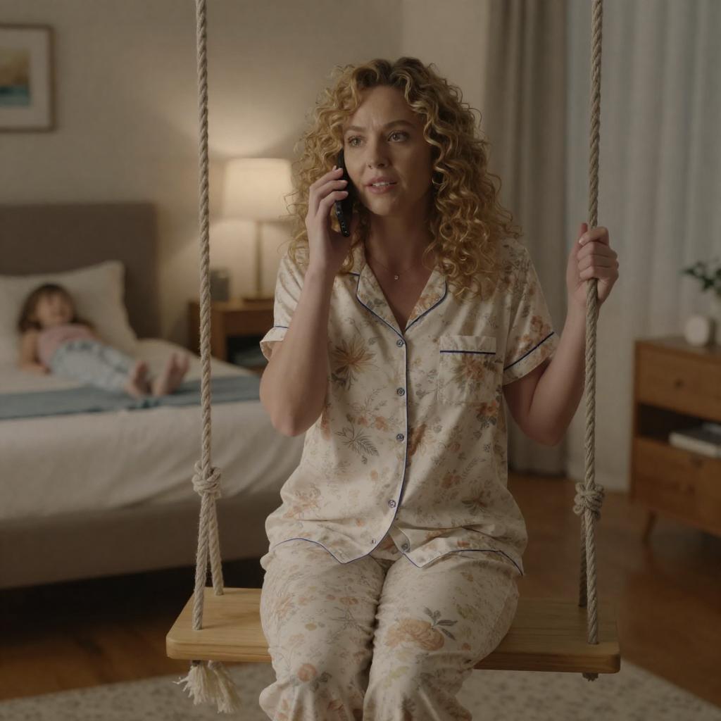 Woman with curly blonde hair, wearing floral pajamas, sitting on a swing, talking on a phone, in a cozy, warmly lit living room. Background includes a bed with a child, furniture, and curtains. Casual, relaxed atmosphere.