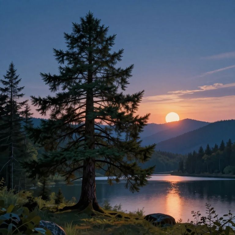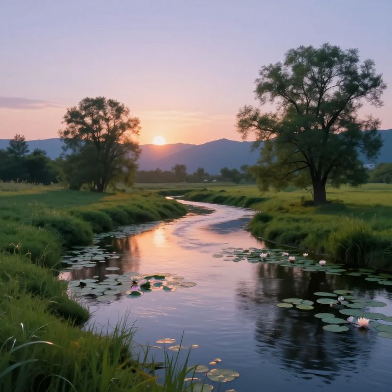 Imagine an impressionistic landscape where a tranquil river flows through a verdant meadow from a unique vantage point. Delicate water lilies float on the river's surface, their petals reflecting a spectrum of iridescent hues under the soft glow of a setting sun. Majestic trees cast elongated shadows across the scenery, with distant mountains blending into the horizon. This evocative image conveys an emotional gradient, capturing serenity while subtly suggesting the ephemeral nature of beauty in our ever-changing world, inviting viewers to experience a moment of peaceful tranquility as light and color weave a dreamlike ambiance that blurs the lines between reality and fantasy.