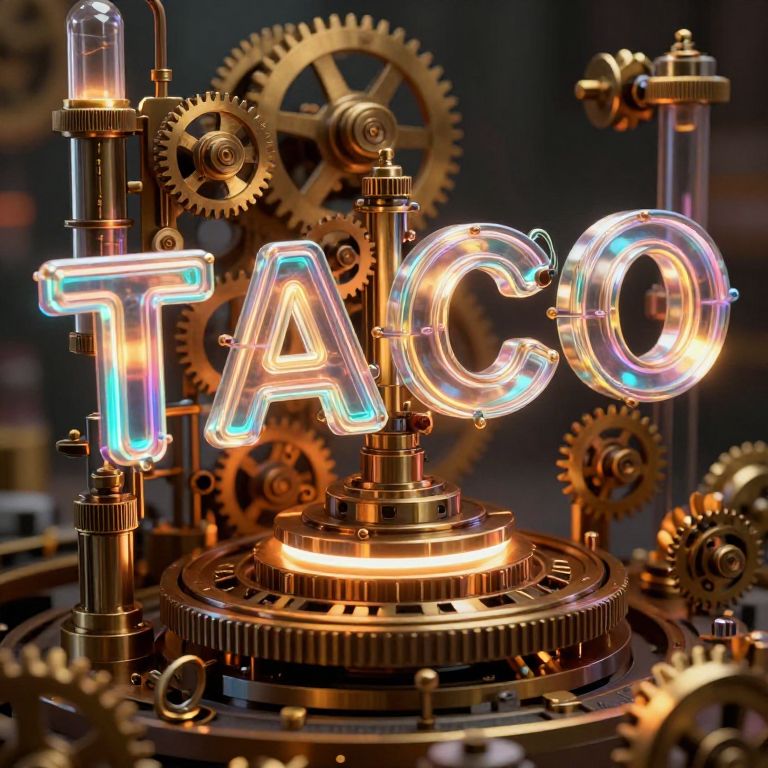 Photograph of glowing, neon "TACO" letters on intricate brass gears, surrounded by illuminated clock mechanisms, creating a steampunk aesthetic.