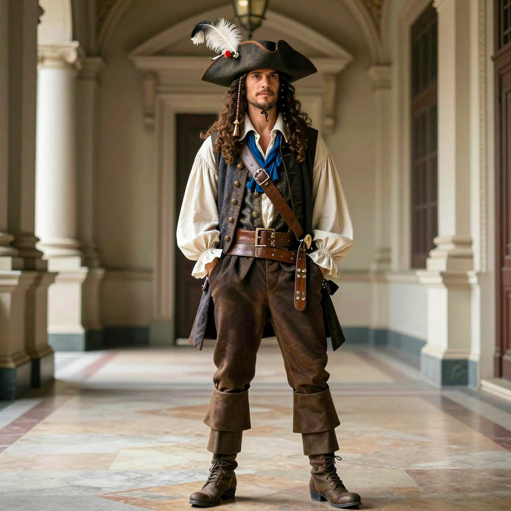 Famous book character, photorealistic, male character, standing, ornate hallway, 18th century pirate outfit, brown vest, white shirt, blue scarf, brown knee-length pants, lace-up brown boots, large feathered hat, columns in background, marble floor, soft natural light, detailed ures, realistic clothing folds, subtle shadows, elegant and historical setting, confident posture, hands in pockets
