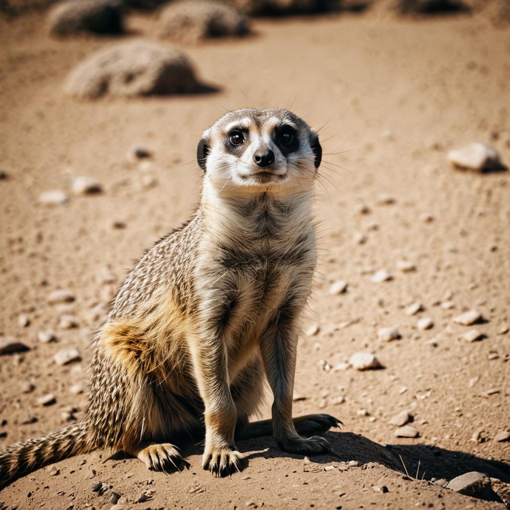 Ultra-realistic close-up photo of a meerkat sitting alert on sandy desert terrain with scattered rocks, showcasing its fur texture and curious expression in natural daylight.