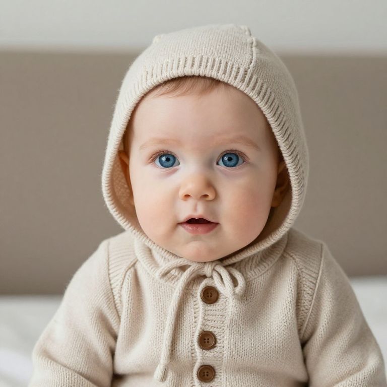 Photograph of a chubby, fair-skinned baby with bright blue eyes, wearing a light beige, knitted hoodie with a hood and a small, tied drawstring. The baby's face is centered, showing a slight, curious expression with slightly parted lips. The background is completely white, emphasizing the baby's face and attire. The hoodie's texture is soft and slightly ribbed. The baby's hair is barely visible under the hood, and the lighting is bright and even, highlighting the baby's smooth skin and the cozy knit fabric.