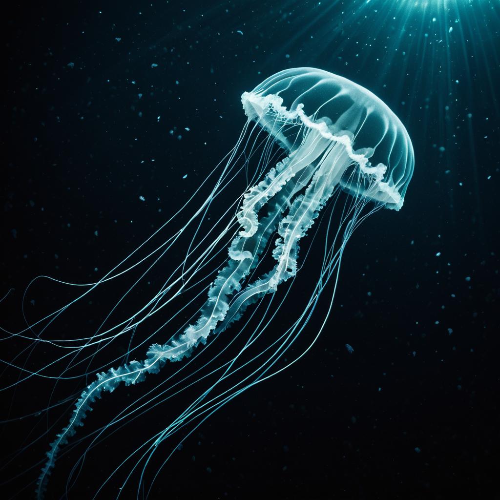 X-Ray artwork of a jellyfish drifting in the sea, a deep, dark oceanic environment with radiant plankton lighting, highlighting fine bone structures and luminous textures