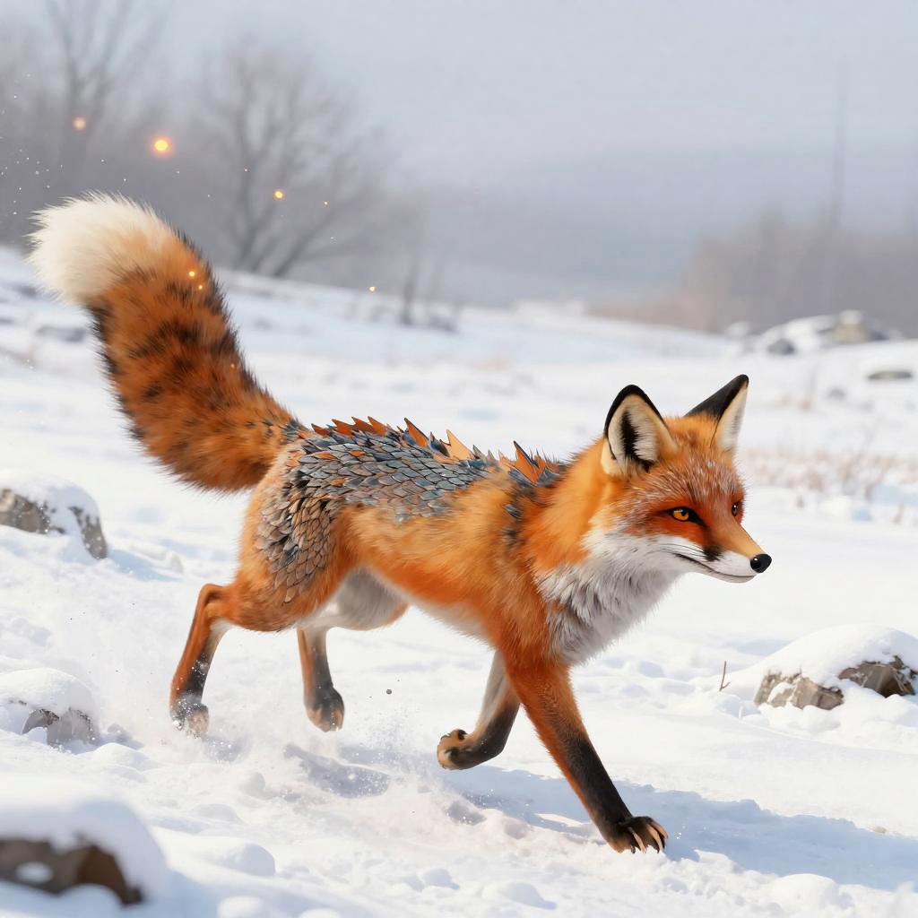 Illustration of a dragon fox hybrid running through a snowy landscape, blending elegance and power with a mix of smooth furry patches and rugged dragon scales, its tail leaving glowing embers in the wind, high fantasy style with dynamic motion.