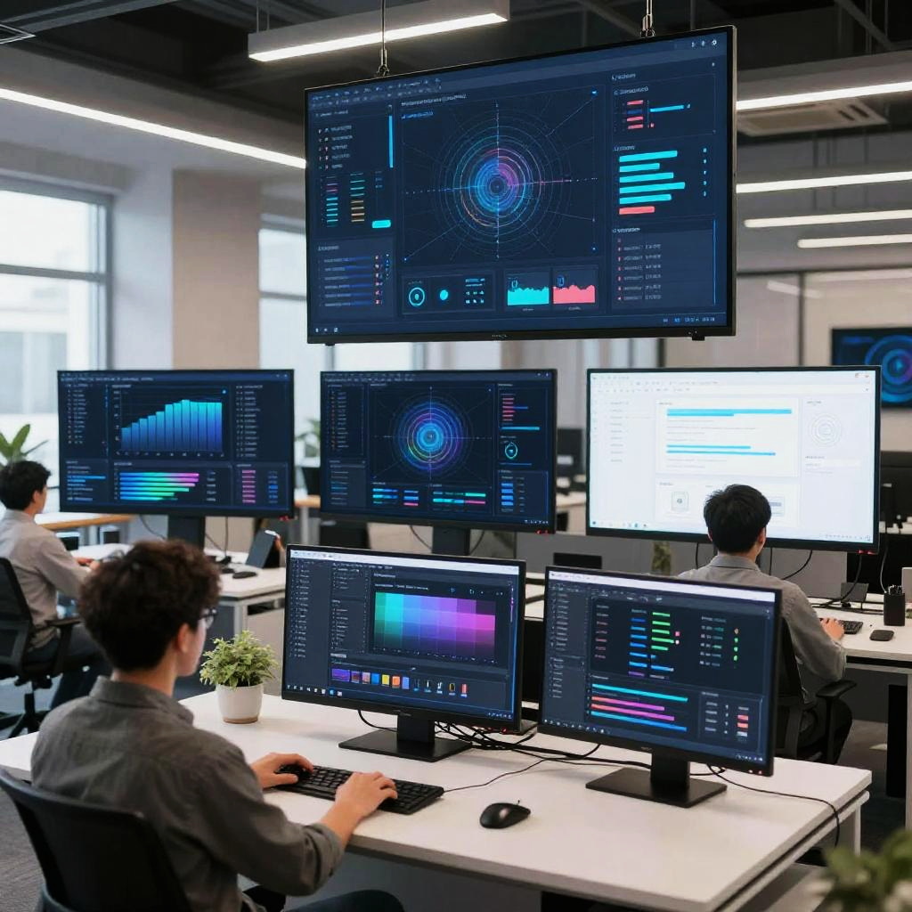 Runway AI alternatives depicted as a variety of cutting-edge AI platforms for digital content creation, showcasing multi-screen setups with graphical user interface panels, holographic data streams, futuristic offices with creative professionals using AI technology.