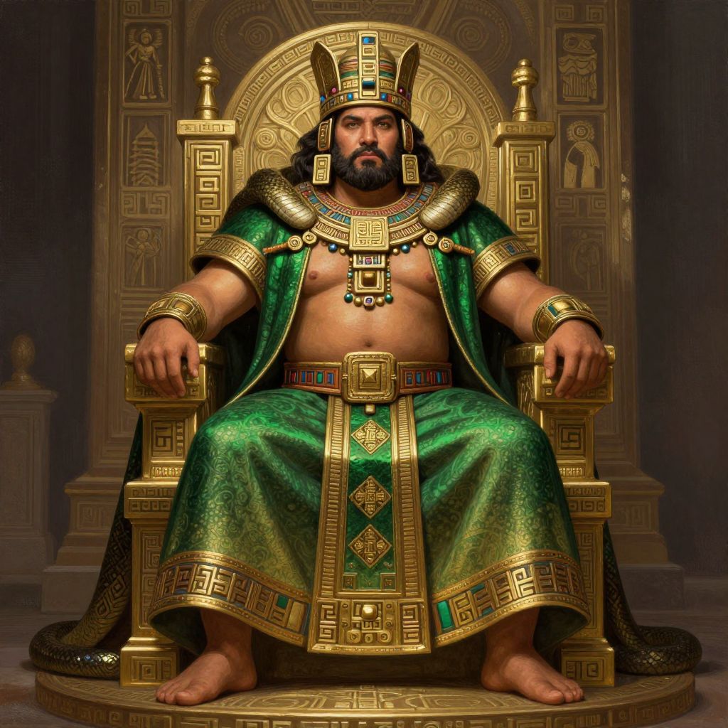 Fullbody portrait of a beautiful aztec fat strong man, snake cape, squared beard, rich cerimonial mantle, d & d character, aztec decorated throne background, by greg rutkowski and alphonse mucha, d & d character, gradient green to gold, highly detailed portrait, digital painting, concept art, smooth, sharp focus illustration, artstation hq
