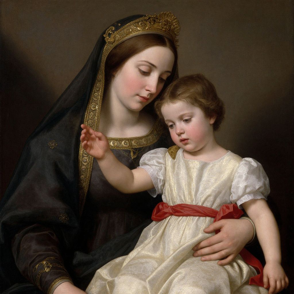 Madonna and Child by Marianne Stokes depicts a tender moment between a woman draped in a dark veil adorned with gold accents and a child wearing a cream dress with a red sash, both gazing downward in serene intimacy.