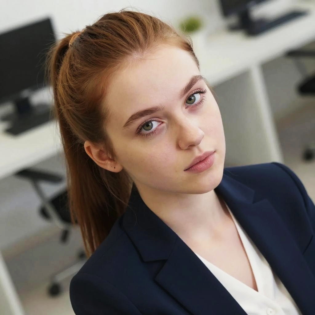 Russian, model, fit face, (best quality, ultra high res, raw photo, masterpiece, extremely detailed photograph), (photorealistic:1.4), 1girl solo focus, looking at viewer, pov, closeup, (sharp chin:1.5), (ponytail), auburn hair, green eyes, from above, young woman, (navy blue business suit:1.5), (office room background, indoor)