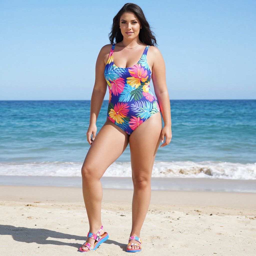 Full body shot, Plus-size woman, vibrant floral one-piece swimsuit, high-cut legs, scoop neckline, adjustable straps, soft stretchy fabric, quick-dry material, bold tropical print, matching beach sandals, lightweight rubber, cushioned footbed, wide straps, slip-on style, bright colors, sun-kissed skin, beach backdrop, playful summer vibe Sexy. Pretty face and beаutiful eyes. Big breasts
