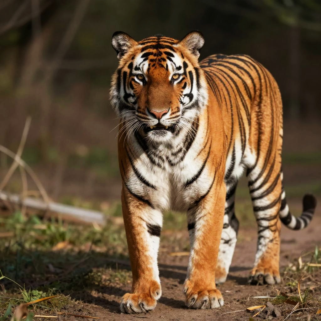 Photograph of a majestic Bengal tiger with vibrant orange fur, black stripes, and white underbelly, walking on a forest path.