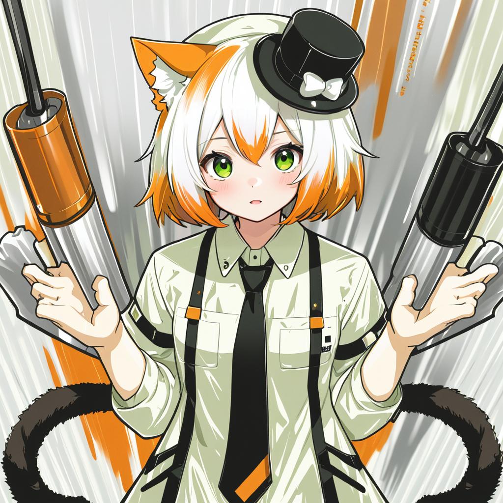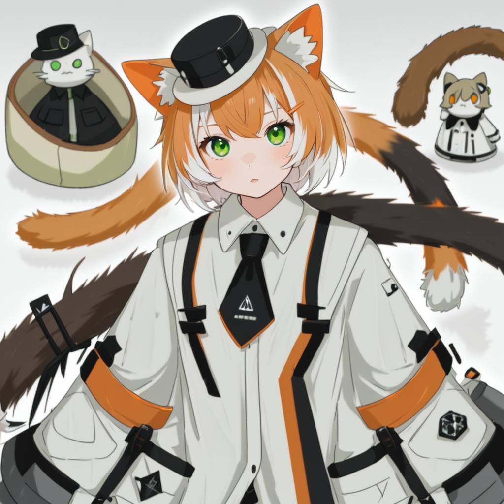 Mousse (arknights), arknights, 1girl, cat girl, cat ears, cat tail, animal ear fluff, two tails, green eyes, white hair, short hair, blonde hair, orange hair, two-tone hair, brown hair, multicolored hair, white shirt, black headwear, mini hat, collared shirt, long sleeves, black necktie, by artist owa (ishtail), anime