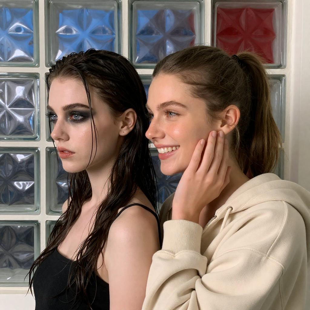 Photograph of two women, one with wet, dark brown hair, pale skin, and dramatic makeup, looking to the left. The other woman has light brown hair in a ponytail, smiling widely, holding her ear. Background: blue and red patterned glass blocks. Woman on the right wears a beige hoodie. Both women are close together, facing slightly different directions.