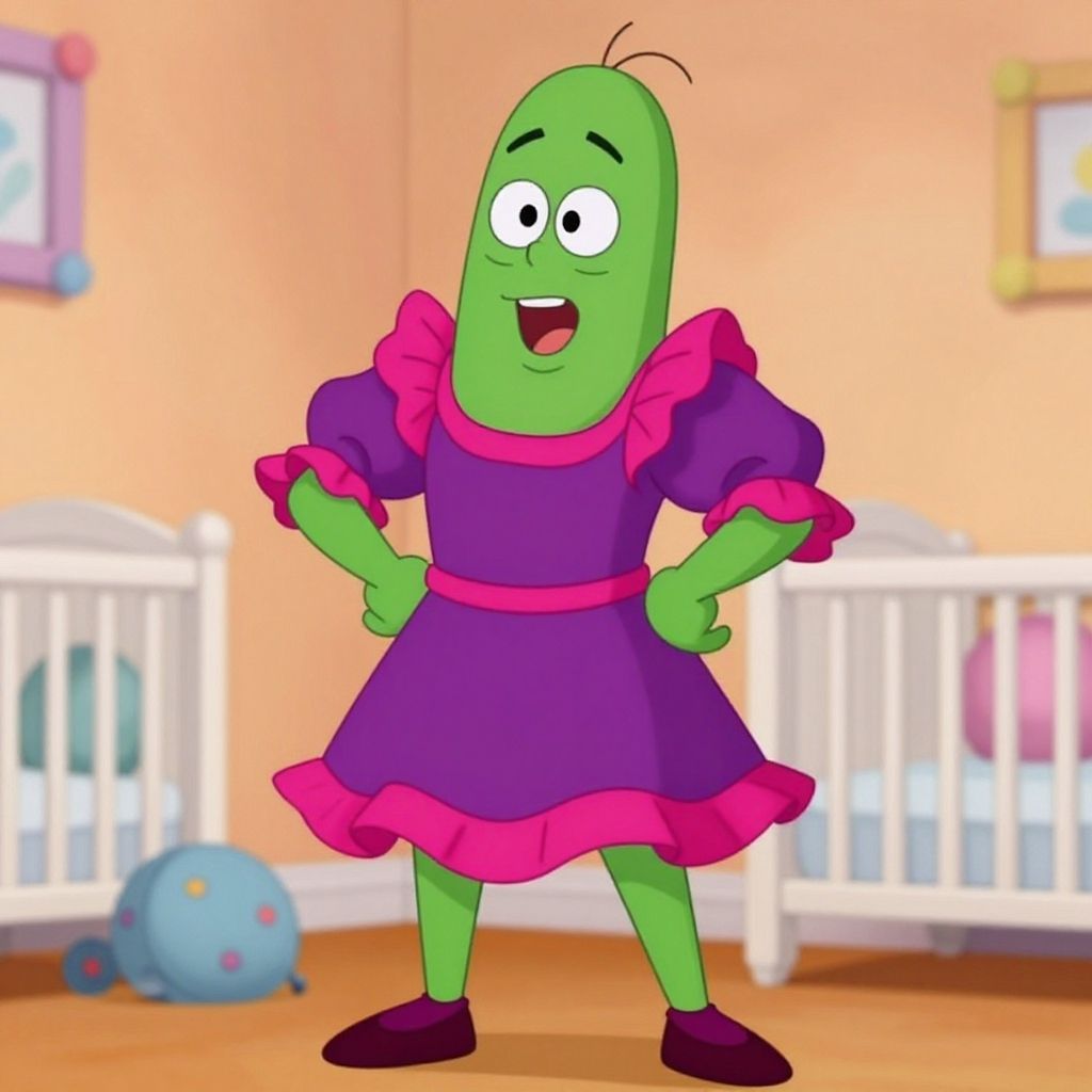 Cartoon-style image of a green, anthropomorphic cucumber with large eyes, holding a smiling baby in a purple shirt and diaper. Background features a sun