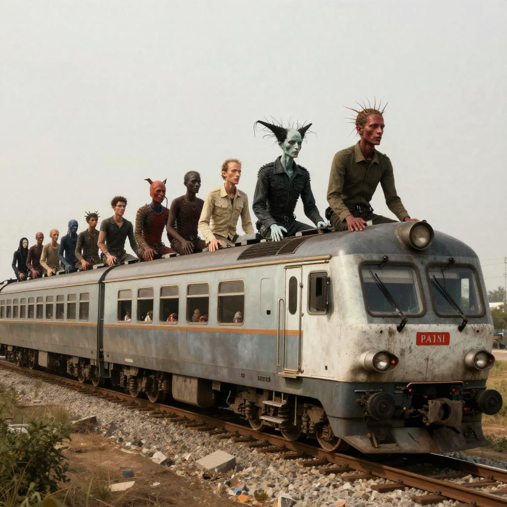 A digital artwork depicts a silver, vintage train with a worn, rusted exterior, traveling on a gravel railway. On top of the train, a diverse group of people and a blue, bird-like creature with large wings sit, leaning forward. They wear varied, 1970s-style clothing in earthy tones. The train's front has a red "RAIL" sign. The background is a bright white, contrasting with the train and its passengers. The image has a surreal, slightly gritty, and futuristic style, with bold, contrasting colors and detailed textures.