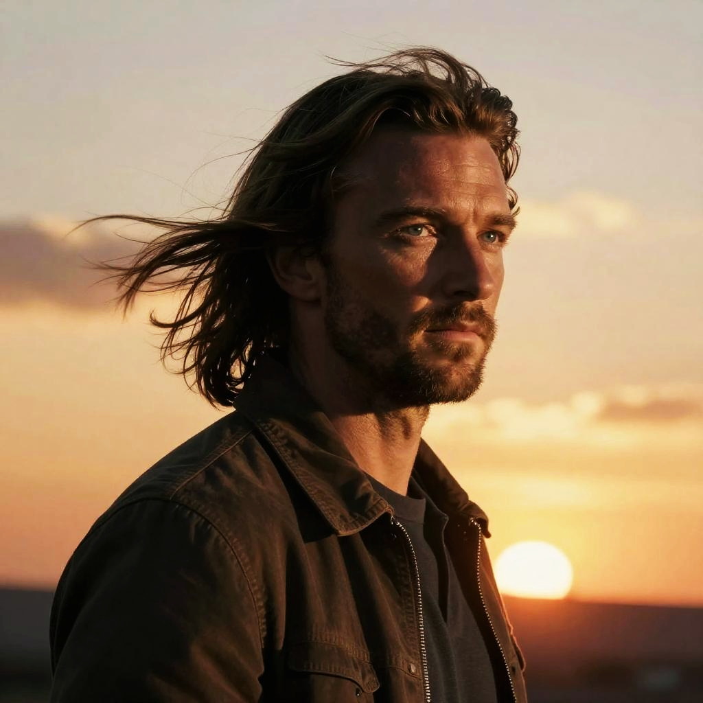 Tobey Maguire long hair style, cinematic portrait with soft lighting, detailed facial features, subtle smile, realistic textures, casual urban background, 4k resolution