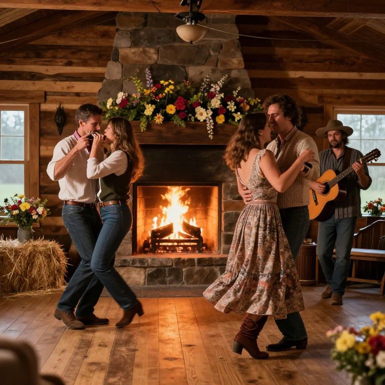 Hoedown celebration inside a cozy country cabin, crackling fireplace in the background, couples spinning and stomping on wooden floor, decorations of wildflowers and hay bales, traditional American folk instruments like harmonica and guitar, warm and nostalgic mood