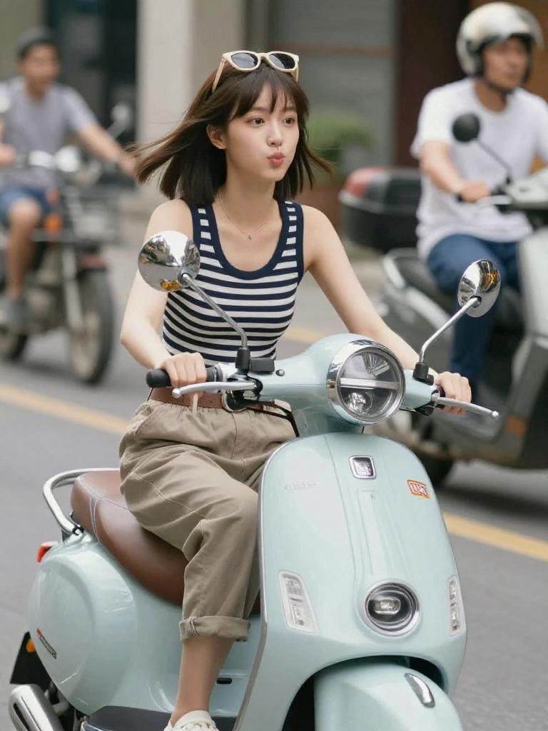 Woman driving a scooter, young brunette woman with shoulder-length straight hair in striped top with rolled-up chinos riding a light blue scooter, no helmet, sunglasses instead on her head, playful and carefree expression, city sidewalk with blurred pedestrians daytime scene, lifestyle stock photo, natural lighting, high resolution