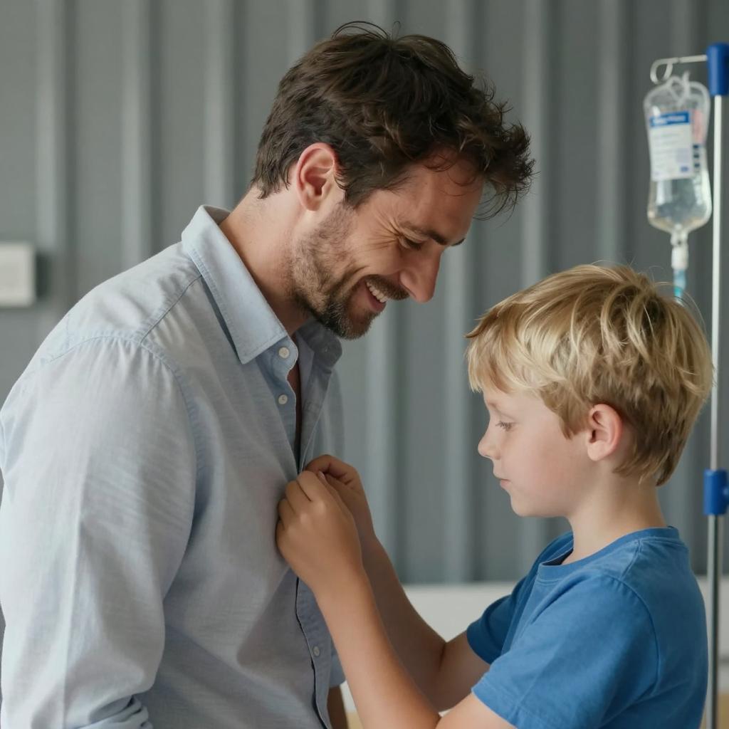 Photograph of a man and boy on a cream-colored couch. Man with medium build, dark hair, blue-striped shirt, relaxed expression, arm around boy. Boy with light brown hair, blue button-up shirt, smiling, wearing blue hat. Both wear blue jeans, sit closely, boy's hand on man's hat. Blue cushions on couch. Background blurred.