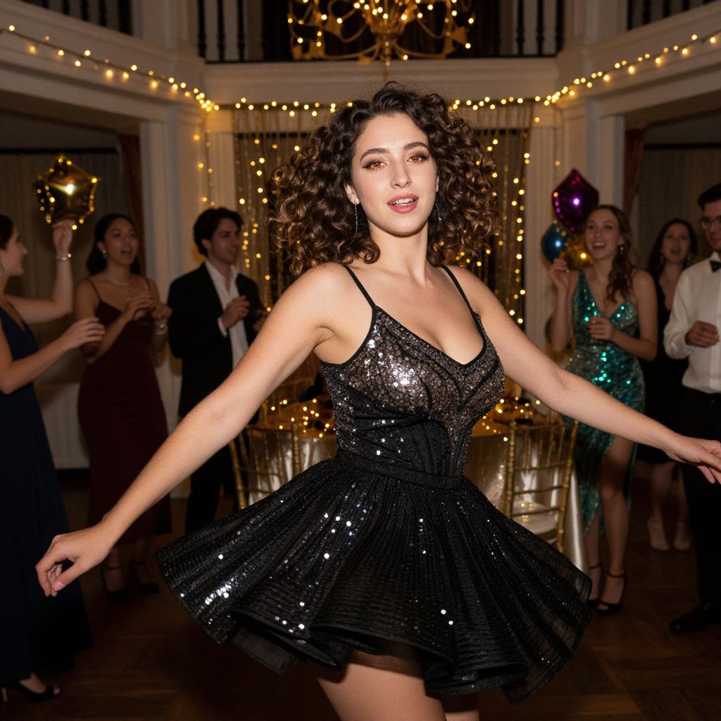 A festive birthday scene at a themed mansion event: a woman with curly brown hair and warm amber eyes is dancing in a stylish black sequin birthday dress under soft fairy lights, the dress shimmering with each movement, surrounded by friends and party decorations.. The woman has big tits and cute face