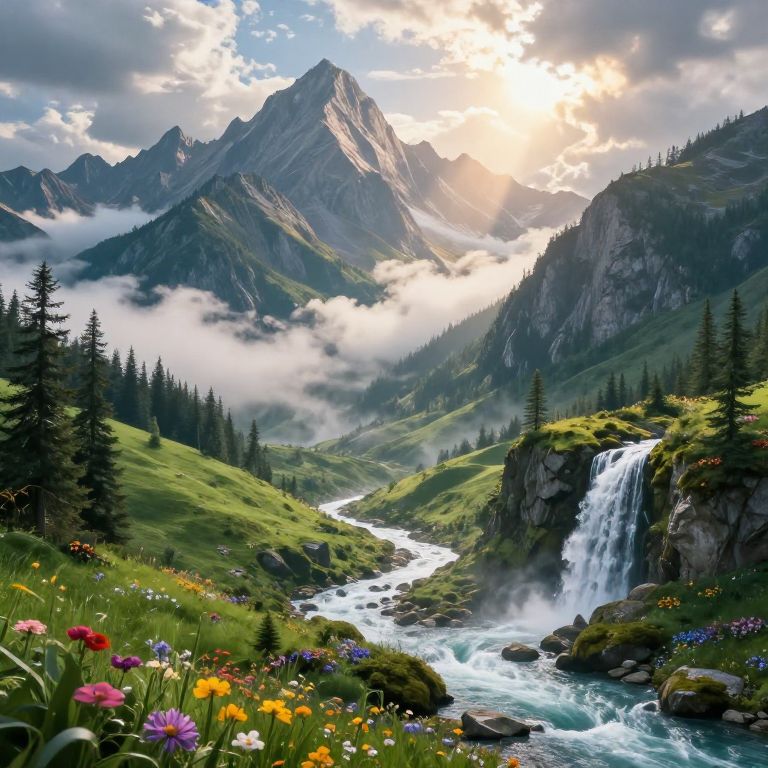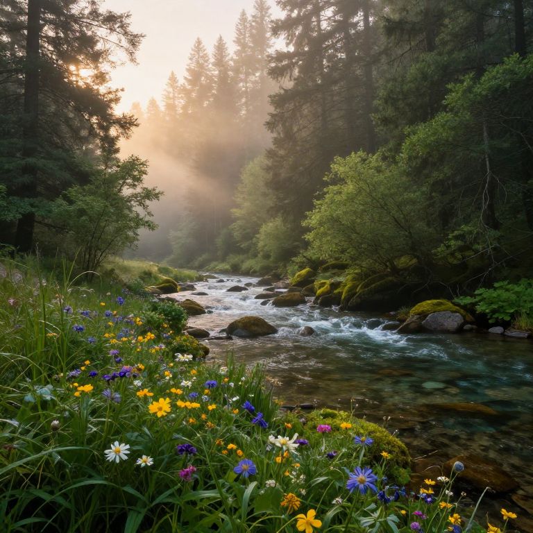 Naturali landscape at dawn, soft golden light filtering through misty ancient forests, vibrant wildflowers blooming near a crystal clear river, peaceful serene atmosphere, hyper-detailed textures, photorealistic style.