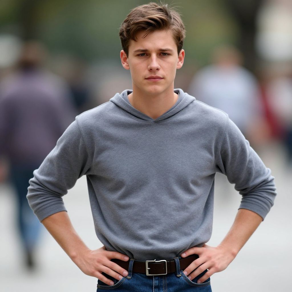 Photograph of a young, handsome man with short brown hair, wearing a gray hoodie and blue jeans, standing confidently with hands on hips, blurred outdoor
