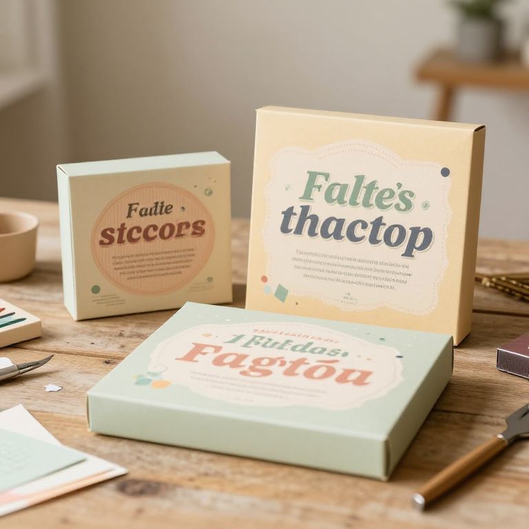 Vintage style faltschachteln with retro typography and pastel color schemes, displayed on a rustic table with scattered paper crafting tools around, soft focus background with warm hues, artistic still life capturing nostalgia and handmade quality
