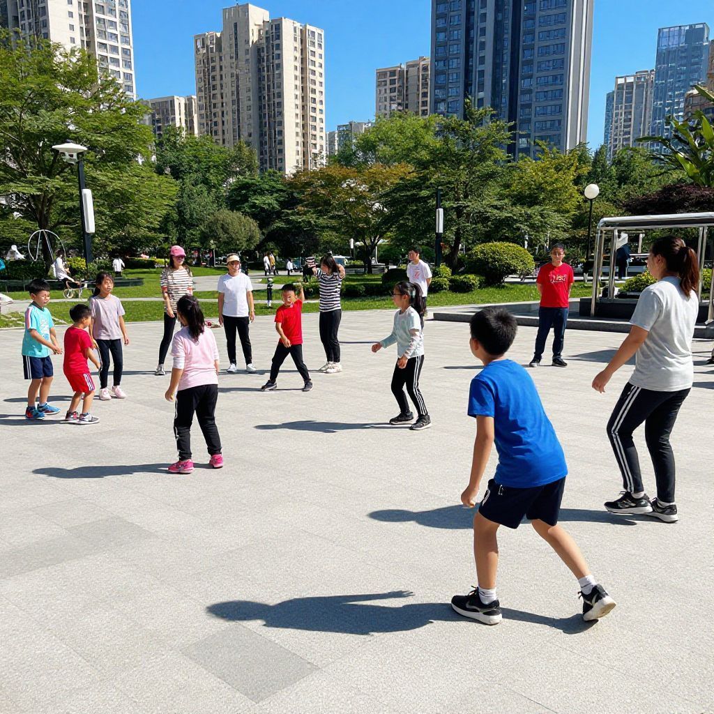 Photograph of a sunny urban park with a group of children and adults playing in a spacious, paved area. The children, wearing colorful T-shirts and shorts, are running and playing, while adults in casual attire supervise. Tall buildings with various shades of gray and white loom in the background, surrounded by lush green trees. The bright blue sky contrasts with the white pavement, creating a vibrant, lively atmosphere. The image has a high-contrast, slightly over-saturated style, emphasizing the vivid colors and dynamic movement.