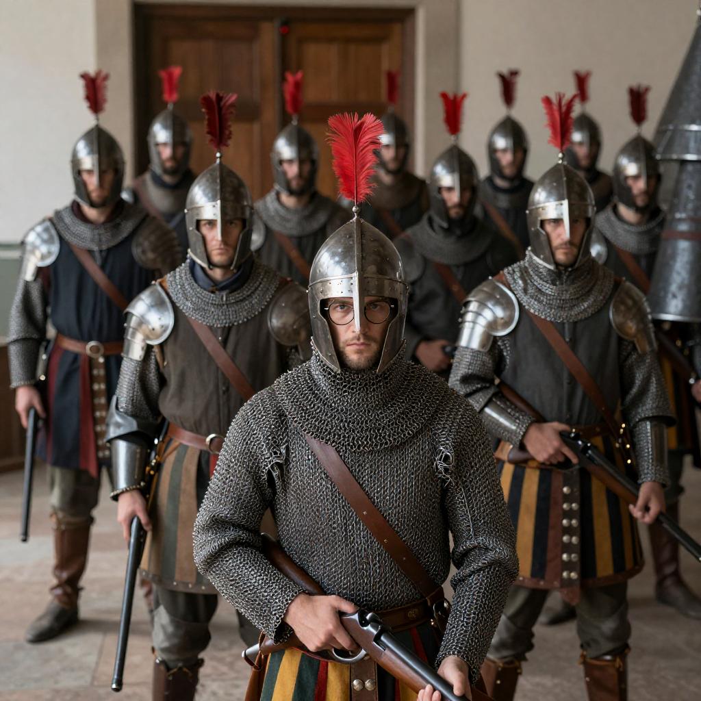 Group of people participating in a historical reenactment outdoors, featuring a central figure in full medieval armor wearing a black hat with a red feather and glasses. Surrounding individuals include a man in a white coat and brown vest, another in black armor holding a staff, and others dressed in gray uniforms with red and yellow sashes and black hats. A woman in a red cardigan, white shirt, and gray skirt stands on the left. The scene takes place on muddy ground with an American flag visible in the background.